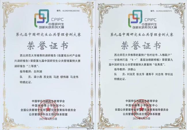 近日,公司收到中国学位与研究生教育学会、全国公共管理专业学位研究生教育指导委员会等颁发的第九届中国研究生公共管理案例大赛获奖证书。公司两支参赛队伍在本次大赛中斩获奖项,创下参赛以来最佳成绩。其中,白列湖副教授指导的《临夏咀头村产业振兴调研报告》荣获调研报告二等奖,洪德山副教授指导的《“包村驻寺,入格联户”——甘南州打造“8+”基层治理新样板》荣获案例优秀奖。
